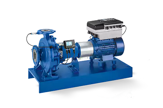 Horizontal volute casing pump, single-stage, with ratings and main dimensions to EN 733, long-coupled, back pull-out design, with replaceable shaft sleeves / shaft protecting sleeves and casing wear rings, with motor-mounted variable speed system. With KSB SuPremE, a magnetless synchronous reluctance motor (exception: motor sizes